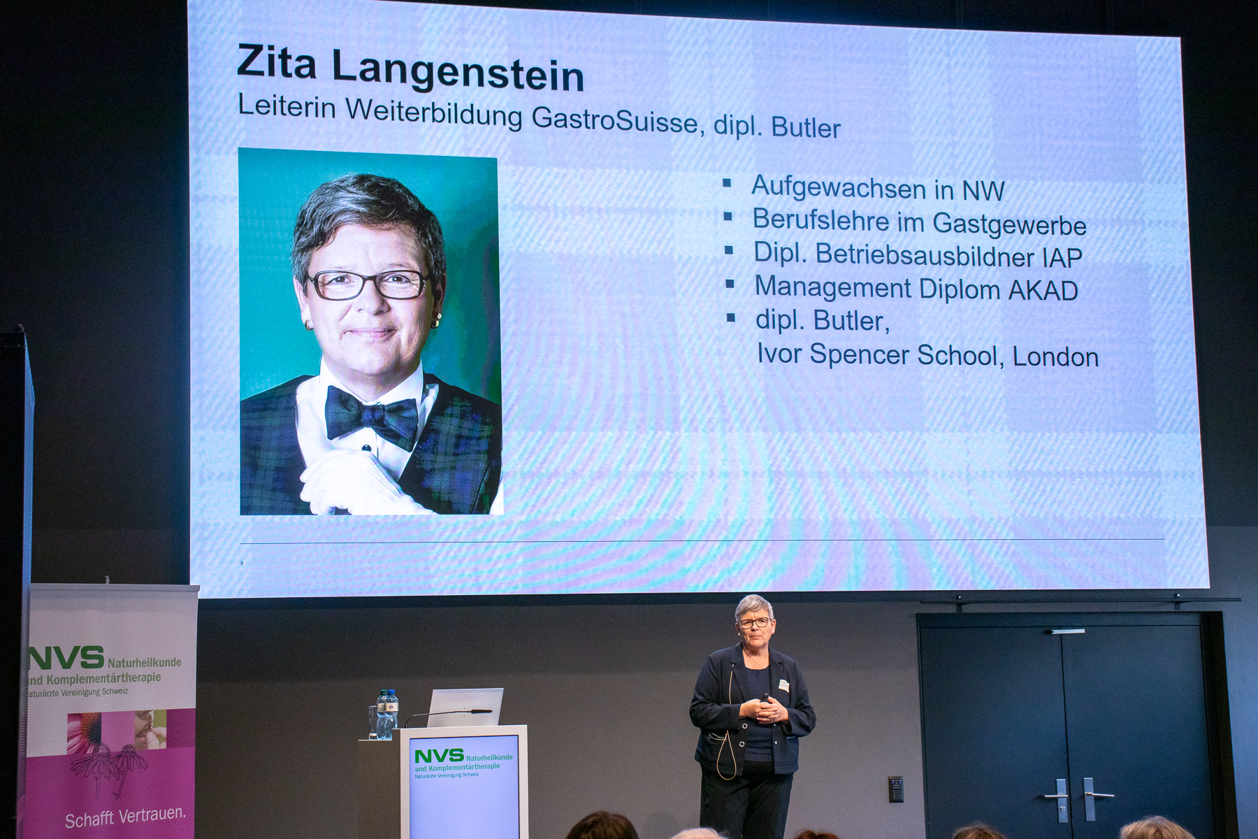 Ein Höhepunkt des Tages war der Gastvortrag von Zita Langenstein. Die Leiterin Weiterbildung bei GastroSuisse und dipl. Butleresse begeisterte das Publikum mit praxisnahen Einblicken in Servicekompetenz im Spannungsfeld von Menschlichkeit und Künstlicher Intelligenz (KI). Mit ihrem feinen Humor und ihrem grossen Erfahrungsschatz zeigte sie auf, weshalb Reklamationen als Chance verstanden werden können, und inspirierte die Teilnehmenden mit wertvollen Impulsen für die tägliche Arbeit.