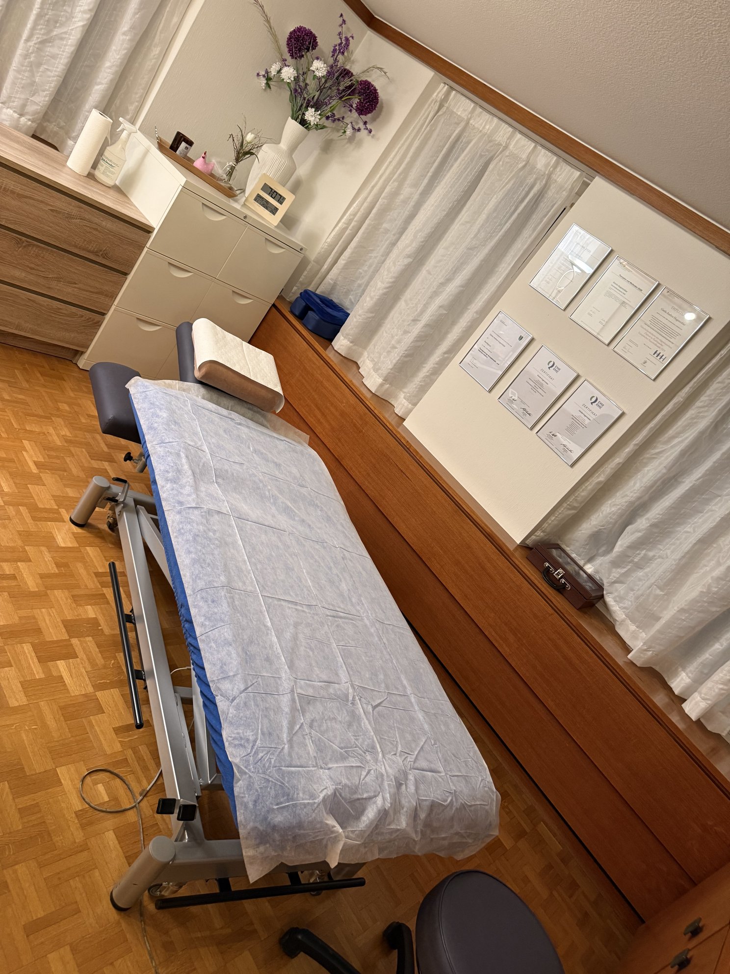 Praxisraum ausgestattet mit: elektrischer Liege, Lagerungsrollen, Pult sowie Stühle, Sidebord für Praxiswäsche, Drucker, Internet