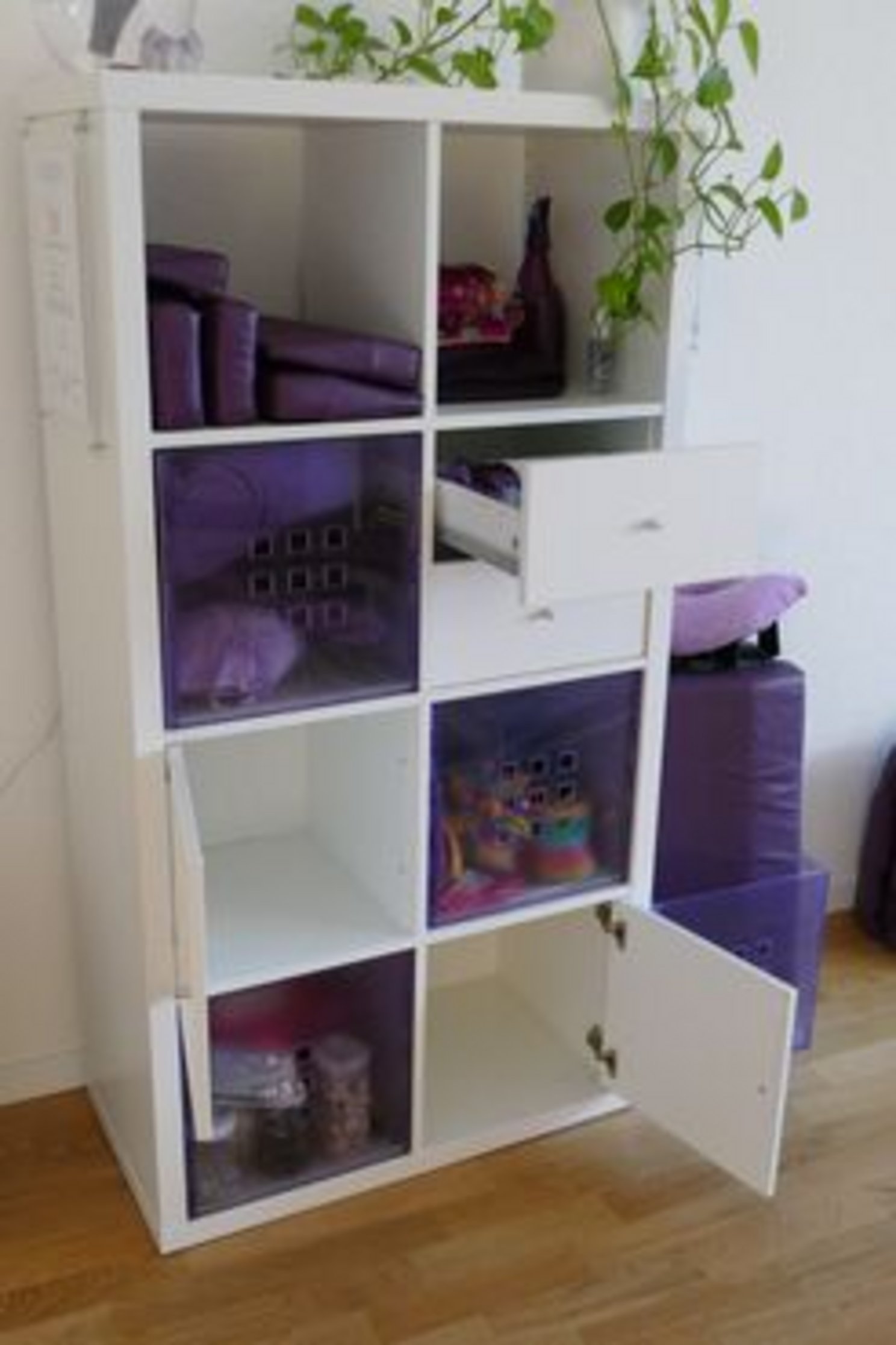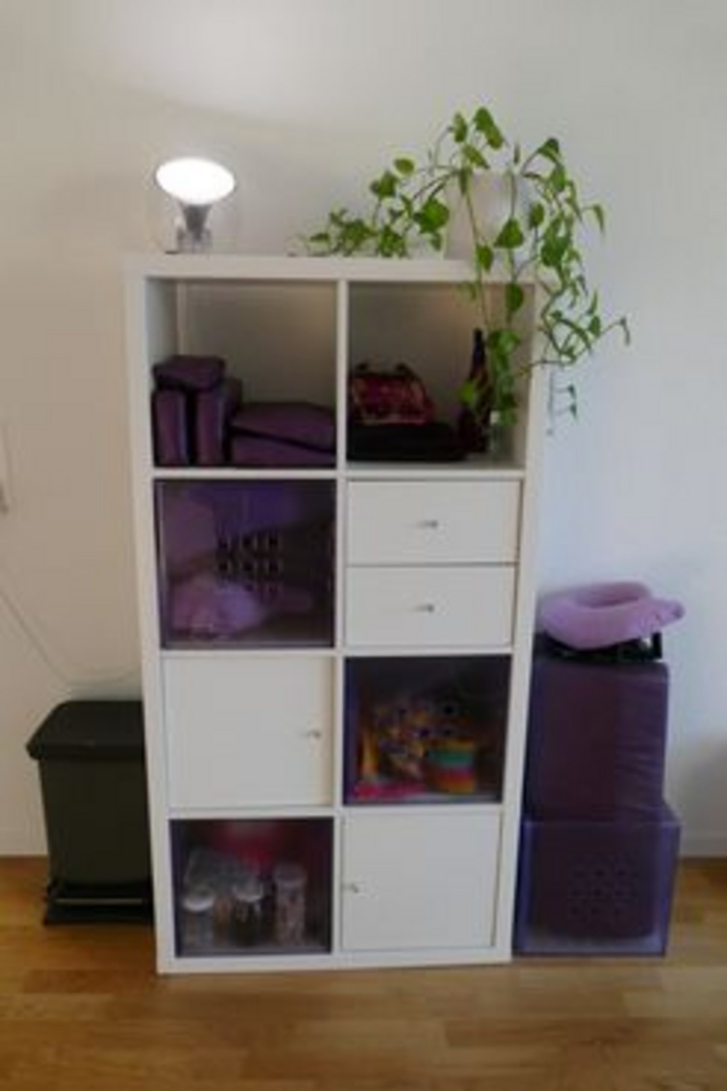 Weisses Regal mit 8 Fächern und 6 dazupassenden Boxen, 2 der Fächer haben eine Türe und 1 Fach 2 Schubladen. H 146, B 78, T 39; Verkaufspreis mit allen Boxen CHF 100.-.