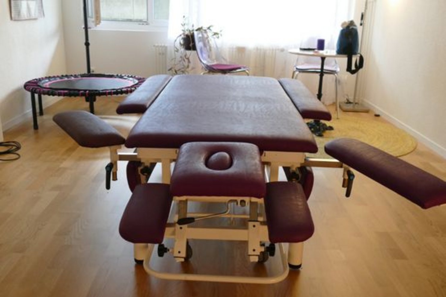 Spezialanfertigung einer Therapieliege, die elektronisch in der Höhe und manuell in der Breite angepasst werden kann. Seitlich ist sie mit zwei mit einem Handgriff leicht herunterzuklappenden Elementen versehen. Gesamte Breite insgesamt 102 cm. Zudem kann rechts und links noch eine Armstütze eingesteckt werden, die stufenlos eingestellt werden kann. Ideal für Shiatsu auf der Liege. Neupreis: CHF 5500.-, Verkaufspreis ca. CHF 2700.-, da initial teure Spezialanfertigung.